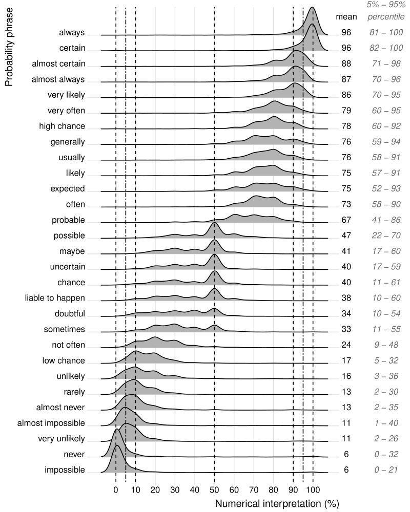 That is why I find this “verbal probability terms” approach so interesting and so useful. Not because the numerical interpretation proposed by the study is necessarily the correct one. It is not that the word likely secretly means 75% and that we can now all proceed with new confidence. That would miss the point entirely.